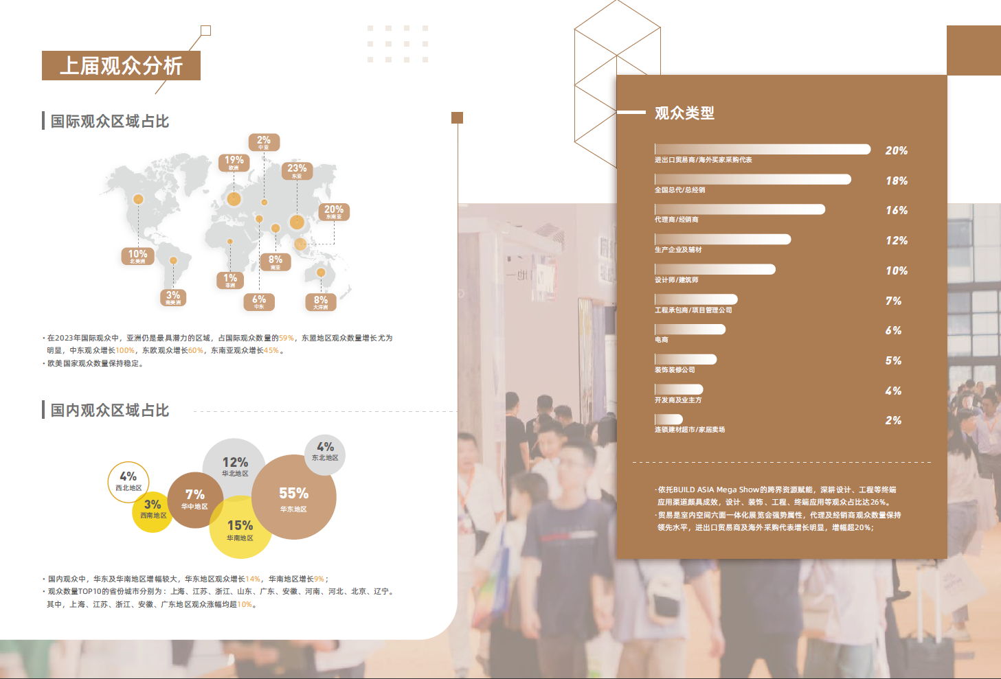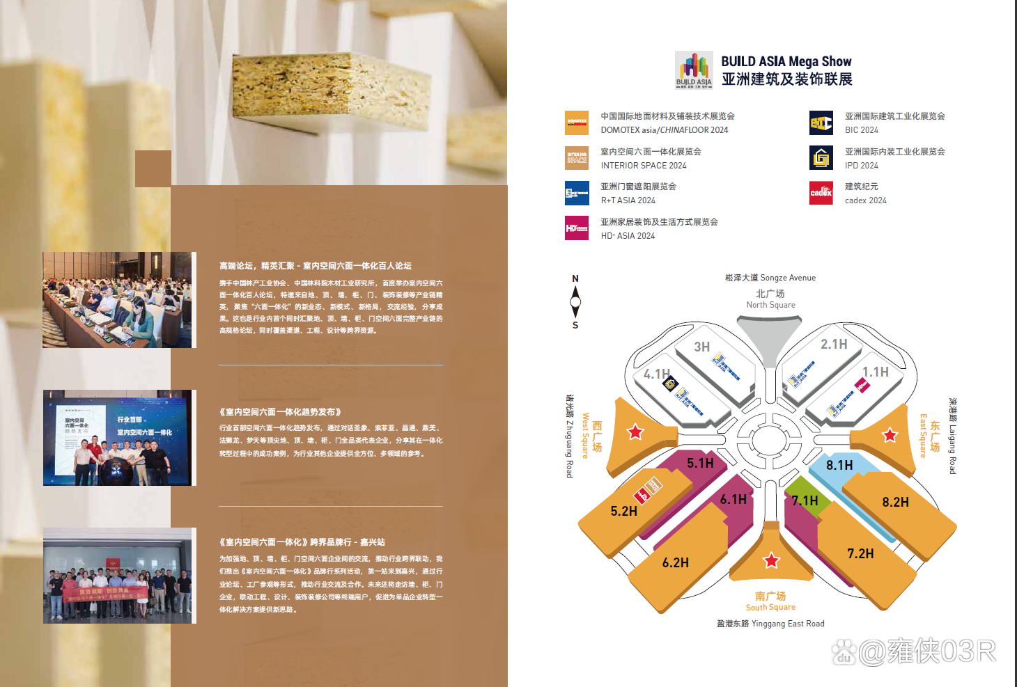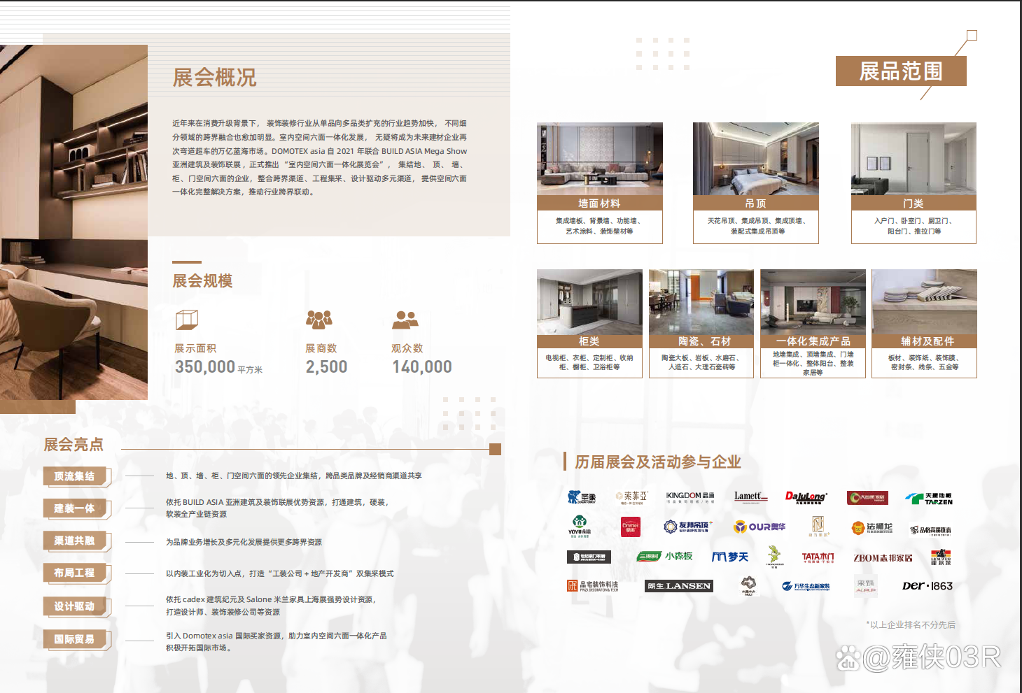 近年来在消费升级背景下, 从单品向多品类扩充的行业趋势加快, 不同细分领 域的跨界融合也愈加明显。室内空间六面一体化发展, 无疑将成为未来建材企 业再次弯道超车的万亿蓝海市场。DOMOTEX asia 自2021 年联合BUILD ASIA Mega Show 亚洲建筑及装饰联展, 正式推出“室内空间六面一体化展览会”, 集结地、顶、墙、柜、门空间六面企业,整合跨界渠道、工程集采、设计 驱动多元渠道, 提供空间六面一体化完整解决方案,推动行业跨界联动。