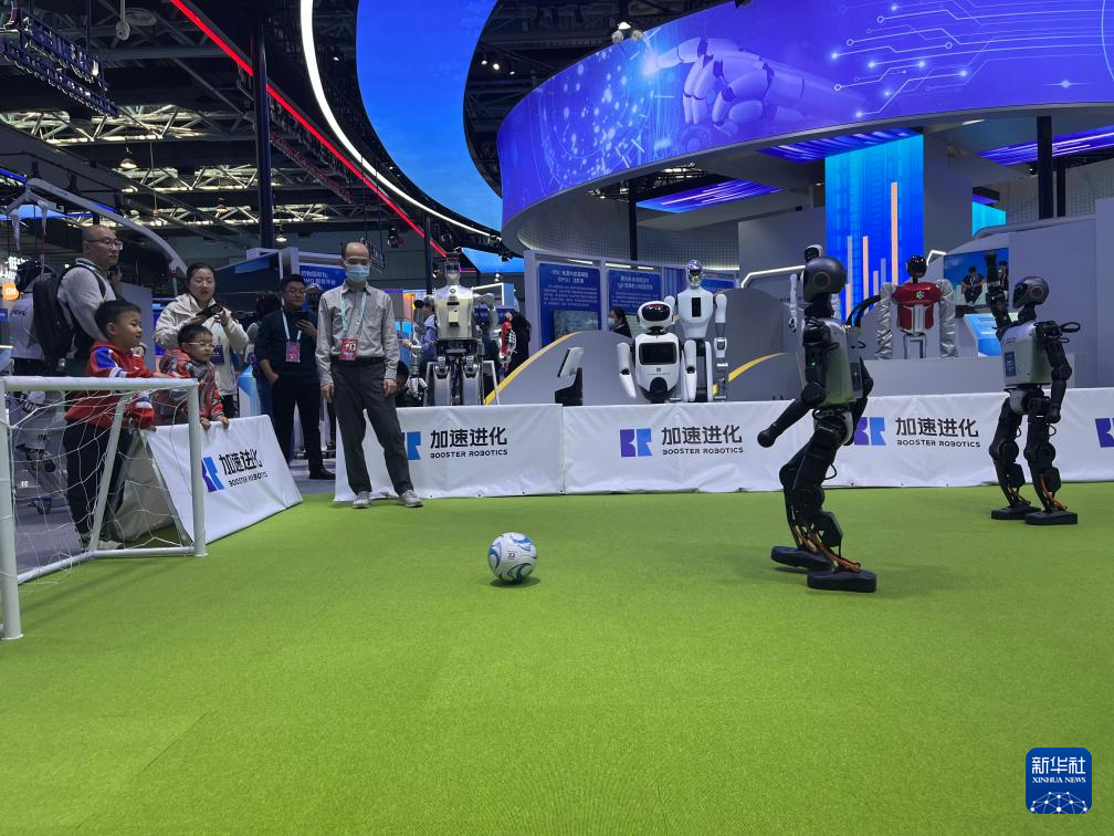 北京加速进化科技有限公司运营负责人宋安琪说:“这款踢足球的机器人拥有较强的运动能力,如果两个机器人发生碰撞,也能保持稳定,即使摔倒了也能实现一秒钟快速起身,这是基于强大的运动控制算法能力。目前已累计交付100多台机器人,主要应用于市场二次开发,下一阶段我们将开拓机器人搬运、巡检、配送等应用场景。”